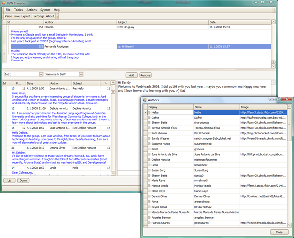 Saša is doing some online community work for TESOL EVO BaW08 event. A part of her work is to create a nicely formatted weekly digest of forum threads (hosted on Yahoo forums). Nice digest is then published on BaW08 Wiki. Since the work is tedious I've created an application, named Webhead Digest Parser, for her and any other member that will do the same work. Using this application cuts 90% of the copy&paste&format work. Instead the user can focus on organizing the messages and other entities. Once the messages, groups and authors are organized the user can Export the output to clipboard and paste it into their Wiki site. You can read more about in Saša's blog post.