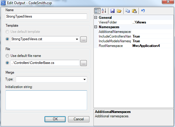 12. If your views do change and they will you’ll have to recreate ControllerBase.cs class. This is really simple. Save all the view files and re-run Generate Outputs on the CodeSmith.csp project (as in step 10.). You can also set code generation on each build if you prefer.