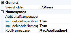 8. Finally, type in the root namespace of your project, MvcApplication4 in my case, into the RootNamespace property on the right side. The complete entry should look like this: