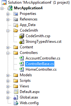 10. Generate the strong typed views by right clicking CodeSmith.csp and selecting Generate Outputs. You should see a new file names ControllerBase.cs under Controllers folder, like this: