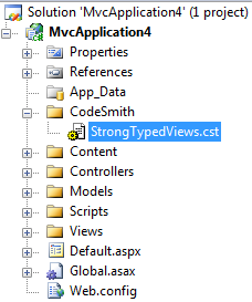 2. Unzip the attached CodeSmith template named StrongTypedViews.cst and put it into the folder mentioned above. Include it into the project. The project should look like this:
