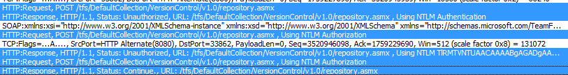 6. I brought up a new weapon: Microsoft Network Monitor to analyse the network traffic. After all TFS communication is through HTTP/SOAP. There I’ve found the first clue to the root of the problem. Normally TFS client would send a request that would be refused by server with response saying that NTLM authentication is required. The client would re-send request with NTLM authentication and everything would work. But when the problem occurs the client just doesn’t respond to NTLM challenge – instead it just throws 401 unauthorized exception without even trying to authenticate against the server. I had no idea why it sometimes work and sometimes not.