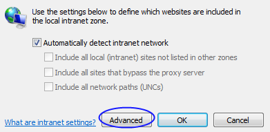 Open Internet Explorer browser, go to Internet Options/Security, select Local Intranet icon, click Sites button