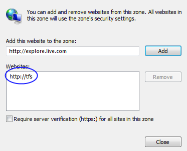 and add your TFS server to the Websites list, like I did with mine (replace TFS with the name of your server)