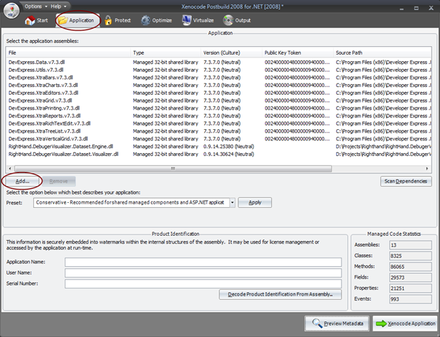 1. Start Xenocode Postbuild for .NET, click on Application tab. Use Add… button to add required assemblies to pack together (you can add assemblies individually or pick most important ones and then use Scan Dependencies button to add referenced ones):