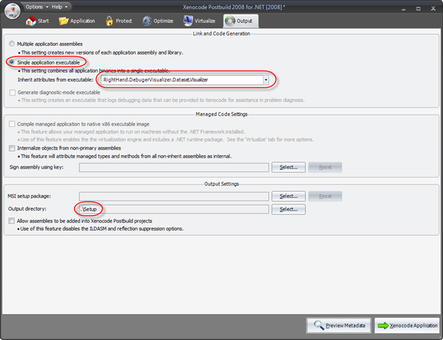 5. On the Output tab I made sure that Single application executable option in Link and Code Generation group is selected and Righthand.DebugerVisualizer.Dataset.Visualizer assembly is the main one. I also selected .\Setup for the output folder.