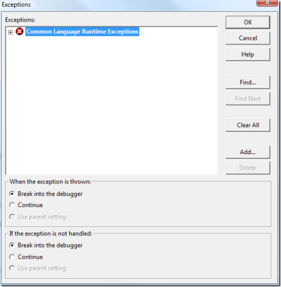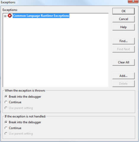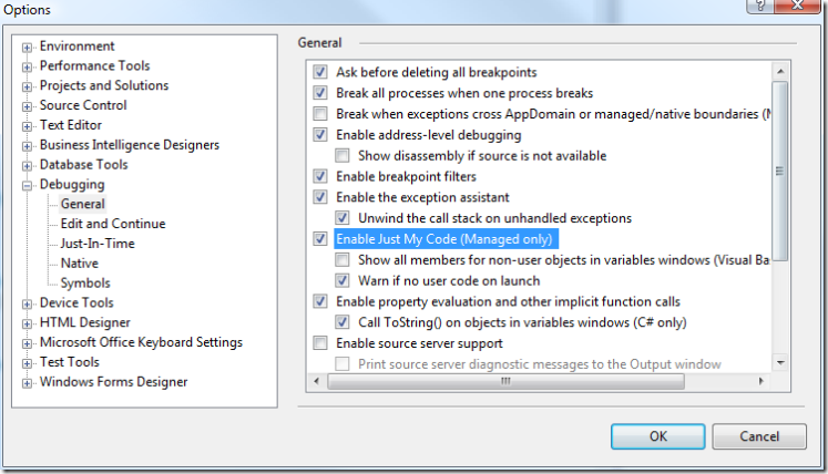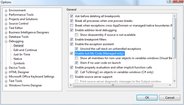 UPDATE: The good news is this behavior is a must only in Visual Studio 2003. Not because of a code change. No, there is actually an option to disable catching non-my-code exceptions. The option is turned on by default. So, here it is:![]()
