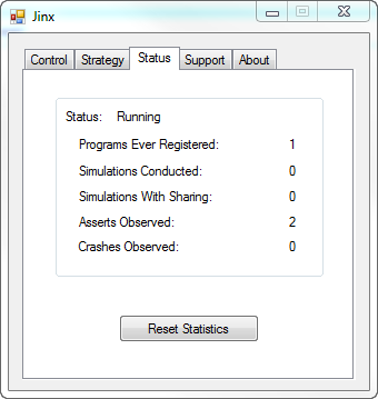 You can adjust some strategy settings on Strategy tab, I’ll skip this as it is an advanced option. And you can see the statistics on Status tab. Let’s run the application now. Jinx will kick in and the CPU will get under heavy load and the system might shutter due to Jinx running versions of the application in parallel. But the assert failure pops up almost immediately – the bug was caught for sure. If you run the application without jinxs there error would manifest much more later if at all and note that the test code in question is an extreme example. Here is the status tab page after a couple of errors caught: