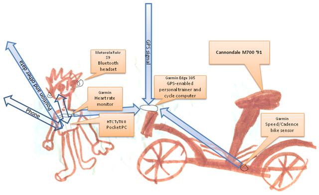 Every (mountain) bicycle should have a bicycle computer and looking back I still remember my first bicycle “computer”, a cheap wired one, I can’t remember the manufacturer. Bicycle computers evolved since then and so did other technologies. Looking at my current bicycle equipment yields this picture, originally drawn by Tevž, my six year son and modified by me (added equipment and descriptions):